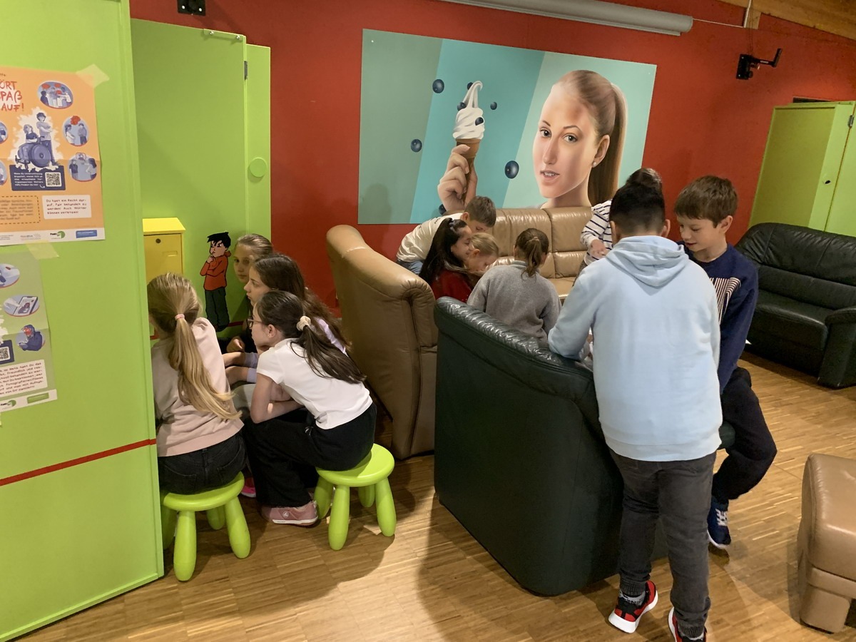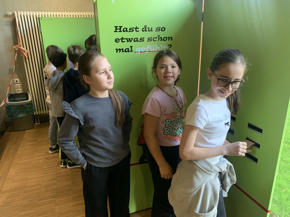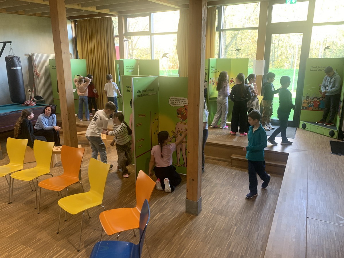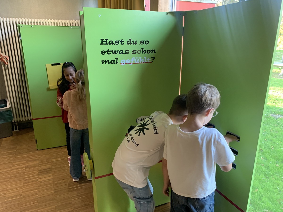 Die Jahrgänge 3 & 4 besuchen zurzeit die Ausstellung “Fühlfragen”. Es handelt sich dabei um einen “Mitmach-Parcours mit 11 Spielstationen zum Ausprobieren, Entdecken und Lernen durch spielerisches und sinnliches Erleben. Dabei geht es u.a. um Gefühle, Grenzen, gute Geheimnisse und böse Geheimnisse. Wer kann helfen, wenn es gefährlich wird und wie kriege ich Mut, auch über schwierige Themen und belastende Erfahrungen zu reden.“
