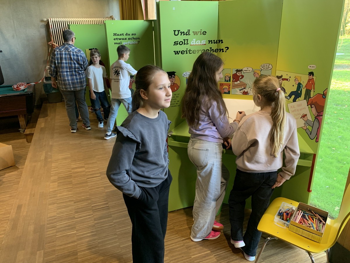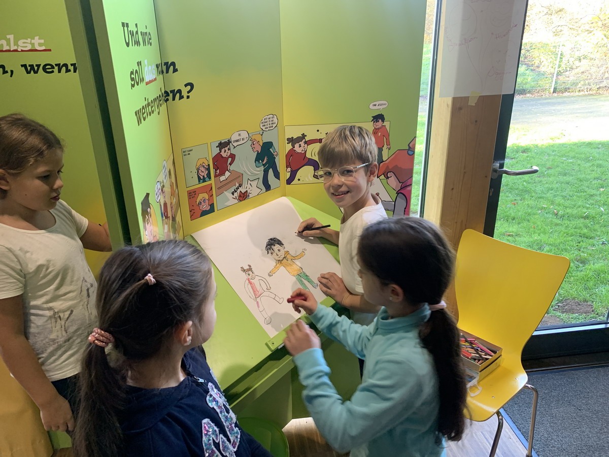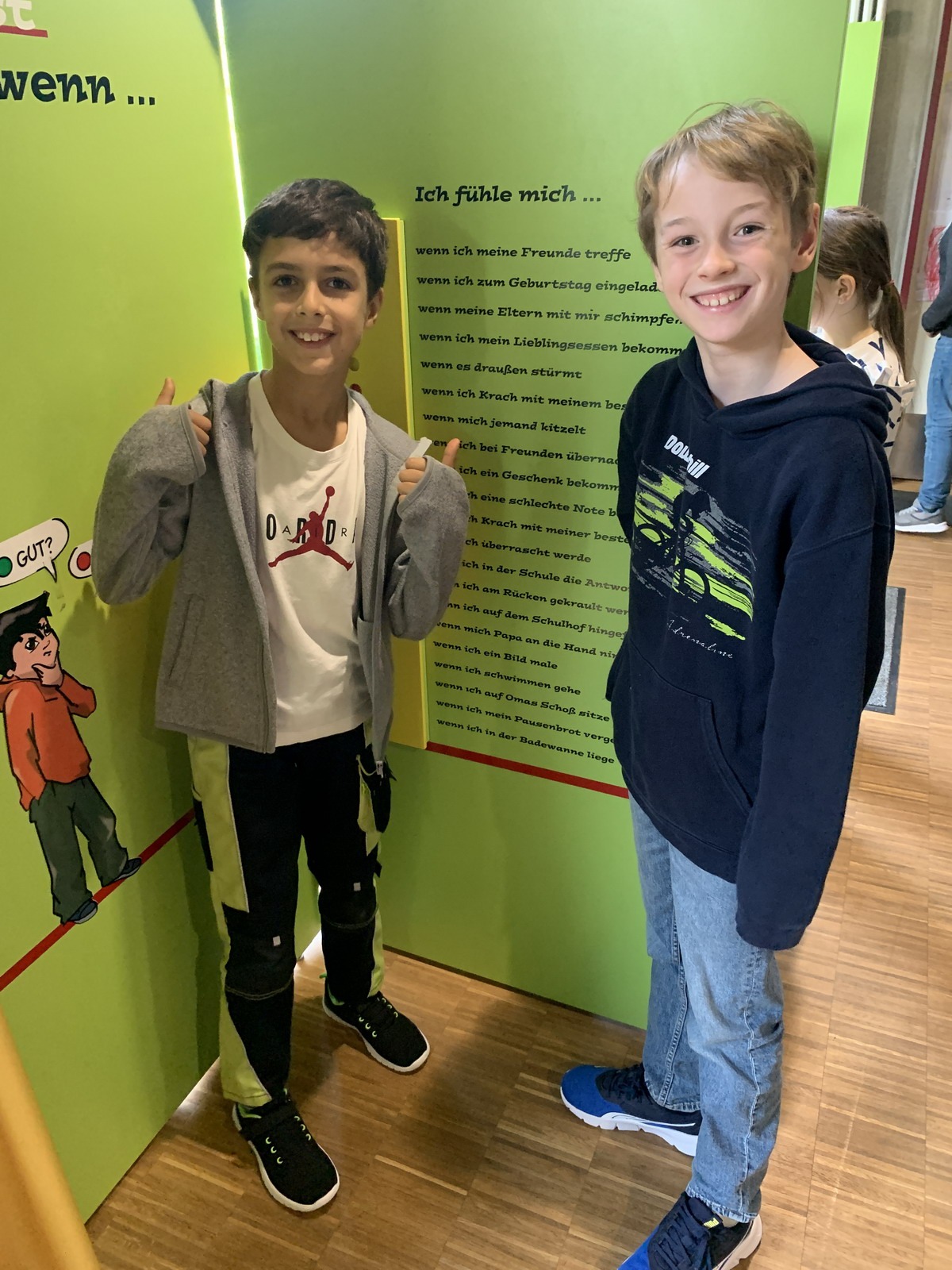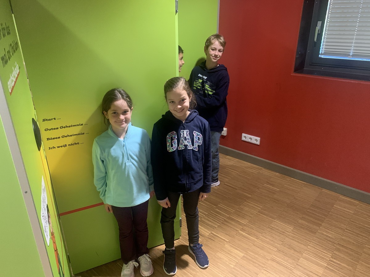 Die Jahrgänge 3 & 4 besuchen zurzeit die Ausstellung “Fühlfragen”. Es handelt sich dabei um einen “Mitmach-Parcours mit 11 Spielstationen zum Ausprobieren, Entdecken und Lernen durch spielerisches und sinnliches Erleben. Dabei geht es u.a. um Gefühle, Grenzen, gute Geheimnisse und böse Geheimnisse. Wer kann helfen, wenn es gefährlich wird und wie kriege ich Mut, auch über schwierige Themen und belastende Erfahrungen zu reden.“