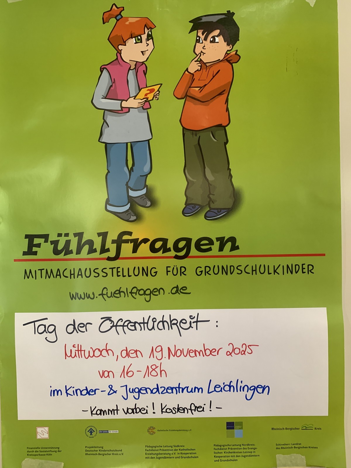 Zum “Tag der Öffentlichkeit” am Mittwoch, den 19. November 2025 sind alle Interessierten herzlich eingeladen. Dieser findet im Kinder- und Jugendzentrum Leichlingen von 16-18Uhr statt.